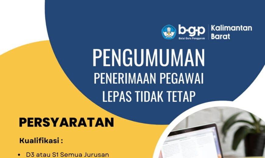 Balai Guru Penggerak (BGP) Provinsi Kalimantan Barat membuka kesempatan bagi Saudara/i sebagai Pegawai Lepas Tidak Tetap guna memenuhi kebutuhan panitia kegiatan tahun 2024 secara daring/luring. Persyaratan Umum: 1. Kualifikasi...